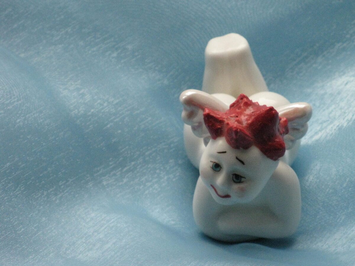 Ein Weihnachtsengerl mit rotem Haar auf blauem Tüll bringt Gedichte zu Weihnachten